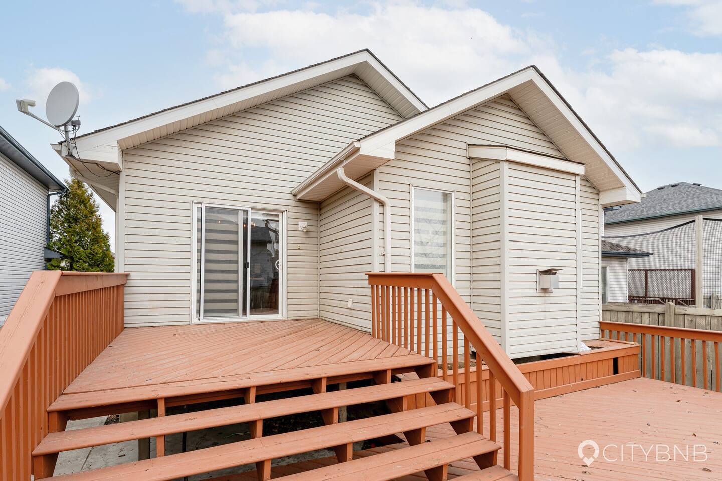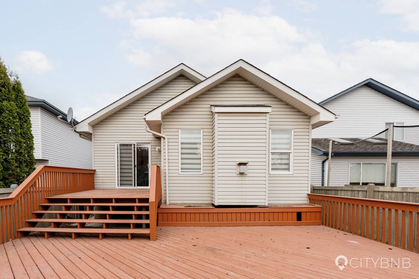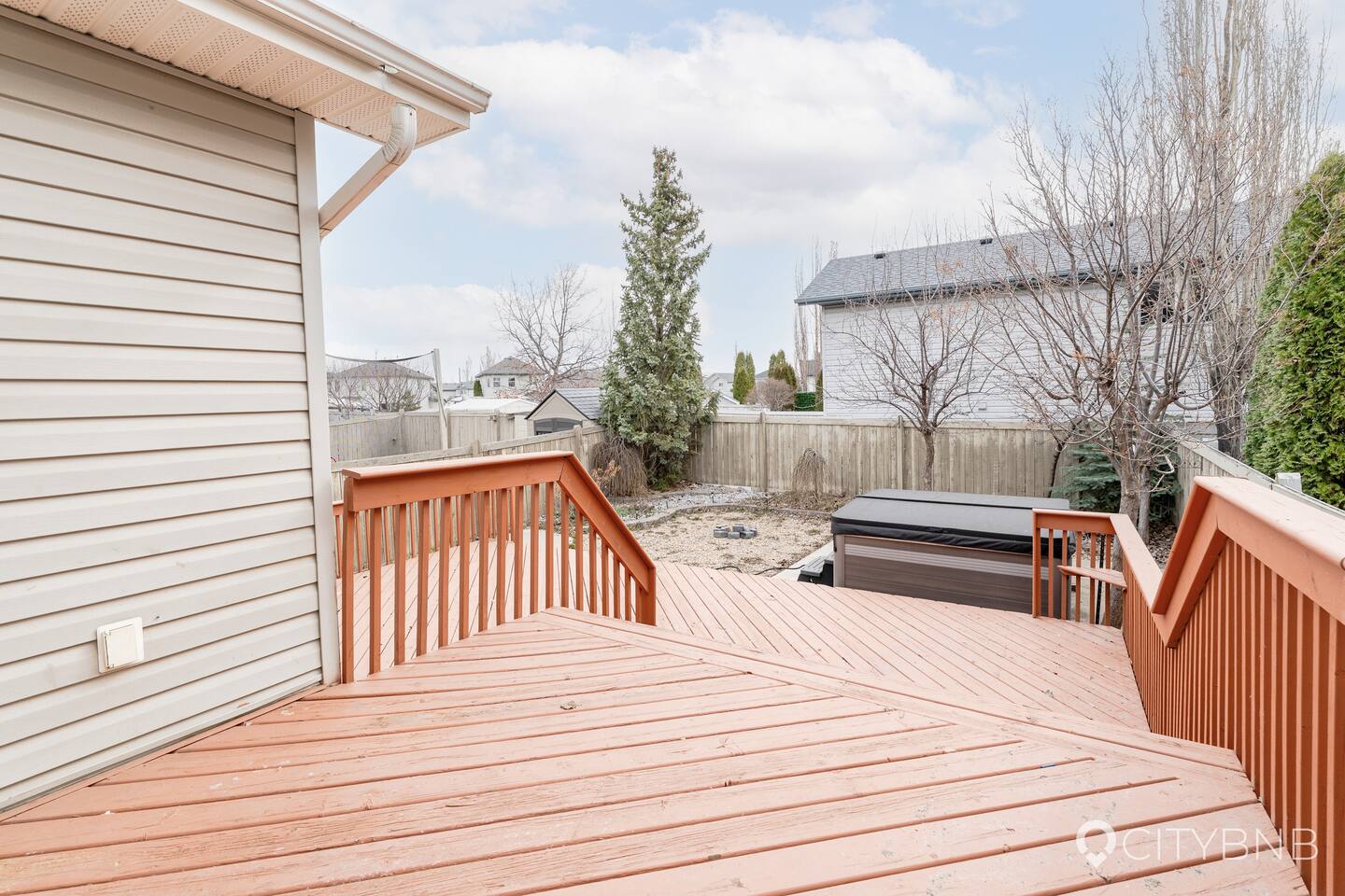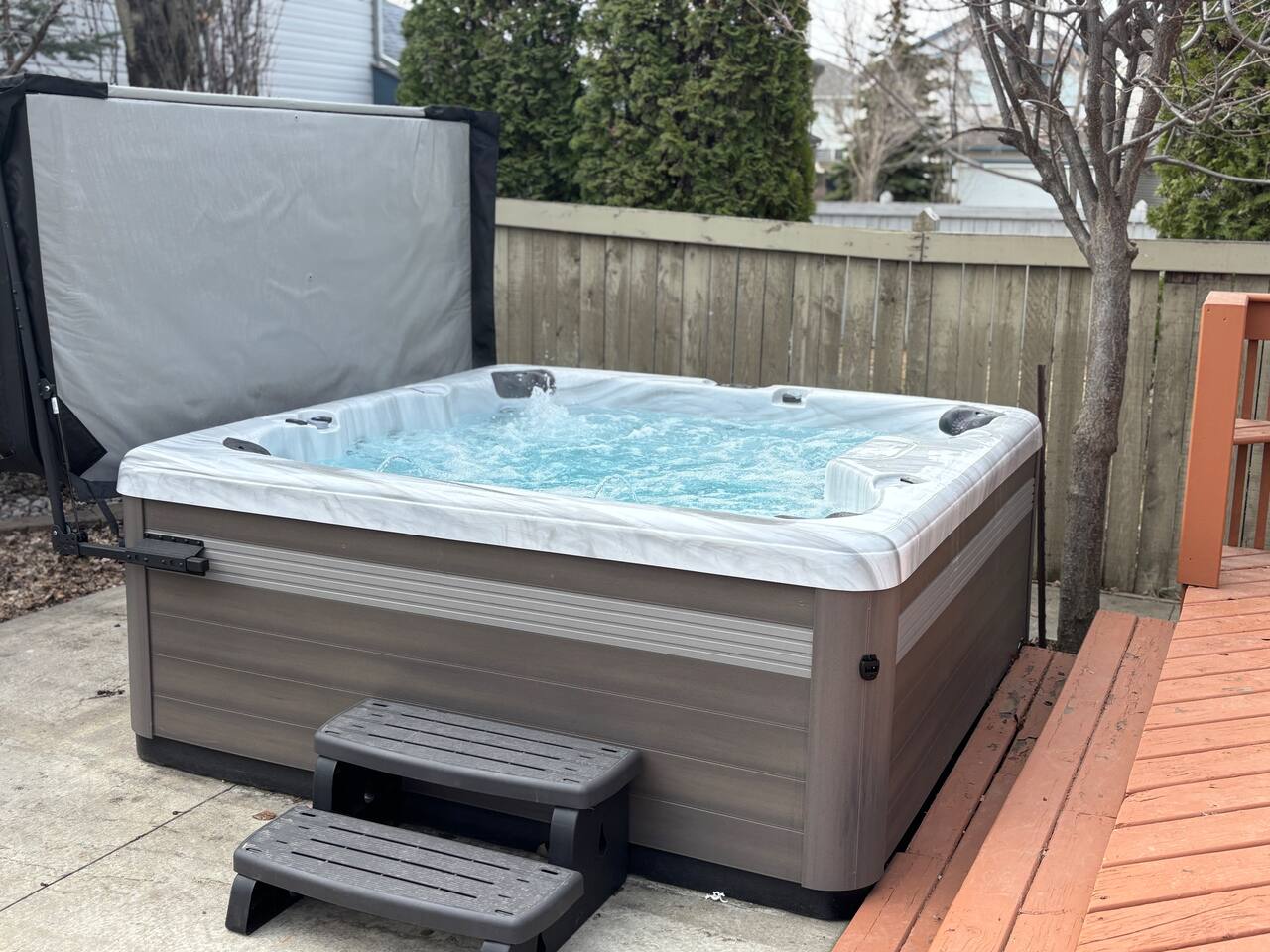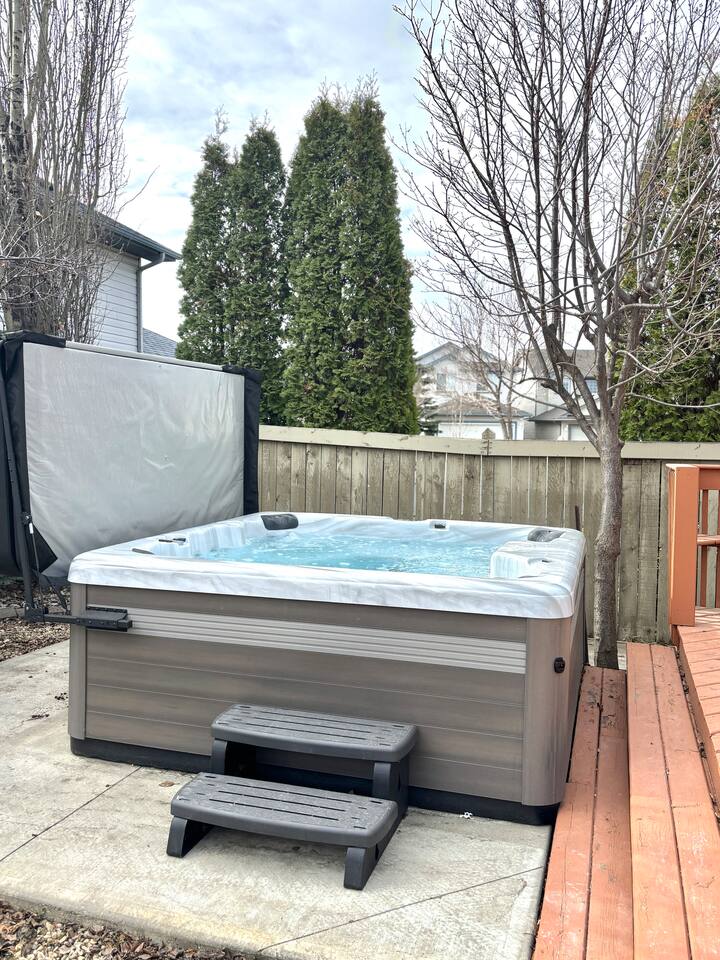 🛏 Sleeps 6 - 3 bedrooms (1 King, 2 Queens) - 2 full bathrooms 🌟 Features - Private hot tub - Fully stocked kitchen - 2 Smart TVs (one with Telus cable) - Games for family fun - Double attached garage + 1 outdoor parking spot - Fully fenced backyard 🏠 Layout MAIN FLOOR - Living room with Smart TV - Kitchen & dining area - 2 bedrooms (Queens) - Full bathroom 2nd FLOOR Master bedroom with ensuite (King) 🌳 Outdoor - Private hot tub - Patio set for outdoor dining - Fully fenced backyard